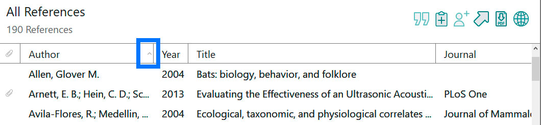 Image: Sort by column function in EndNote Desktop. Copyright © Clarivate. Used under licence.