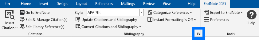 Image: Windows Configure Bibliography button within Word's EndNote tab. Copyright © Microsoft. Used under licence.