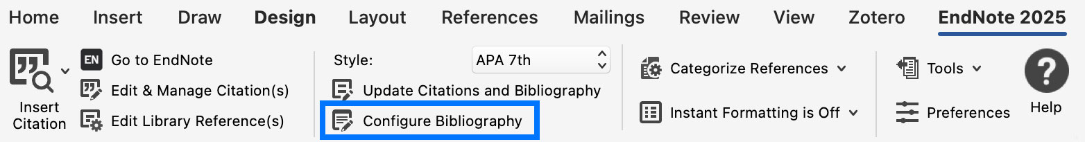Image: Mac Configure Bibliography button within Word's EndNote tab. Copyright © Microsoft. Used under licence.