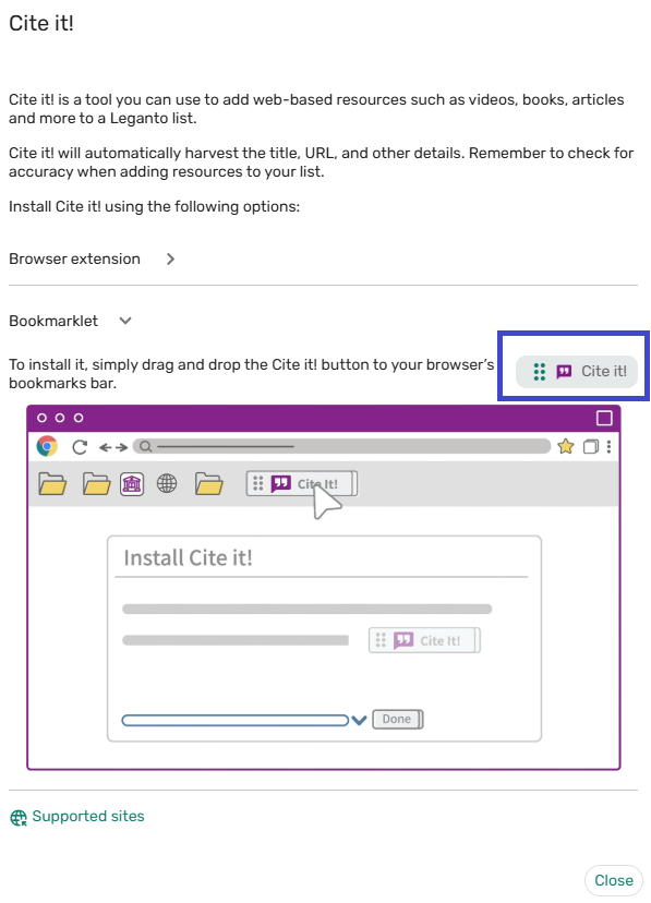 Cite it is a function that allows you to add internet resources to your Reading List using an extension from your browser's toolbar.